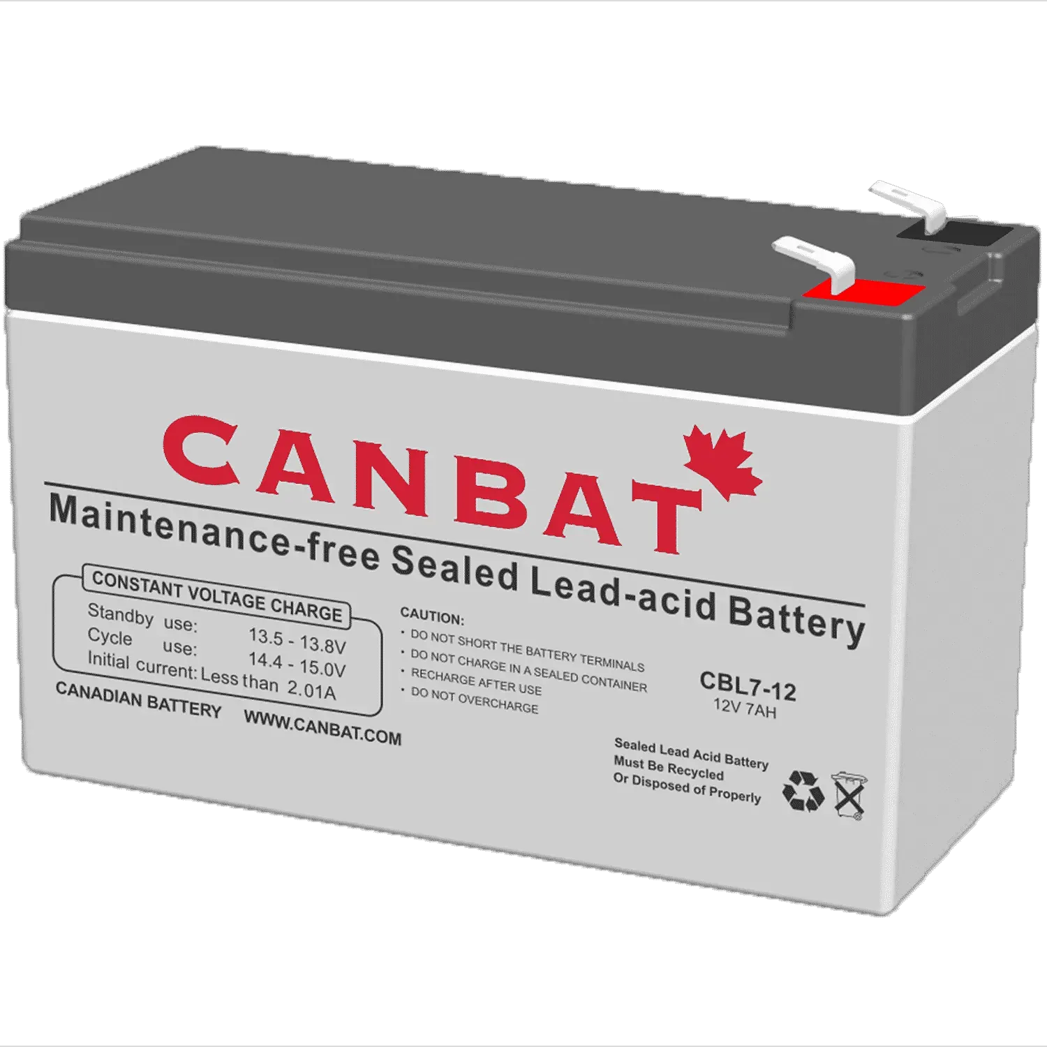 The Canbat CBL7-12 battery is a 12V 7Ah rechargeable sealed lead-acid (SLA) battery with T1 Terminals. This 12V SLA battery is designed for light cyclical and standby applications such as alarms, UPS systems, exit signs, emergency lighting systems, booster packs, toy ride-on vehicles, medical equipment, telecommunications systems, and much more. Canbat 12V 7Ah SLA battery is engineered with Absorbent Glass Mat (AGM) technology offering superior performance and high reliability. AGM batteries are valve-regulated and spill-proof, allowing safe operation in any position. This 12V 7Ah SLA battery also offers unbeatable power to volume ratio yielding greater energy density.